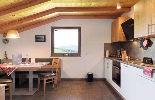 a spacious, fully equipped eat-in kitchen with a cozy corner bench and a sofa bed with TV&SAT;