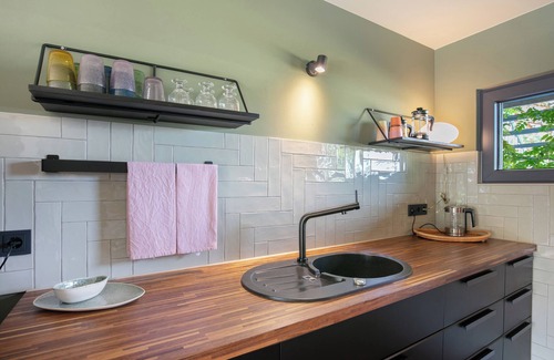 Living area with access to large terrace and garden. Fully equipped, open kitchen with dining area. 2 bedrooms each with double bed 160x200, insect screens, and one bedroom with bunk bed 90x200, insect screens. Bathroom with walk-in shower and separate WC, towels (one guest towel 30x50 and one towel 70x140 per person). Small herb corner, fire bowl, barbecue and sculptures in the garden. Large and small terrace with 2 large parasols, table, chairs, 2 beanbags and sun loungers. WLAN, bed linen and parking included.