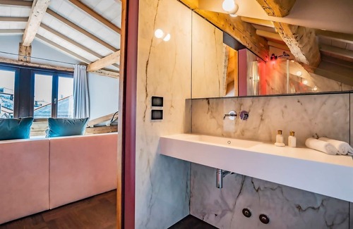 Apartment Stella is a stylish penthouse offering canal views and a private rooftop terrace, just moments from St Mark’s Square. Perfect for a romantic escape, its open-plan living space combines timber floors, beamed ceilings and exposed brickwork to create a calm, contemporary atmosphere. A well-equipped kitchenette, dining nook and cosy lounge area provide everything needed for relaxed evenings after exploring the city.The bedroom features pastel tones, a comfortable double bed, and an ensuite bathroom cleverly hidden behind a rose-pink sliding door. A second bathroom with a chromotherapy shower adds extra comfort. The highlight is the rooftop ‘Altana’ terrace, an inviting spot to sip a morning coffee or evening prosecco while enjoying city views and the gentle rhythm of Venetian life.
