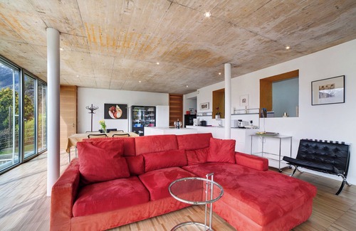 Two separate bedrooms located inside, two large bathrooms with shower and bathtub. Two large wardrobes. Fully equipped kitchen island in the living area. Screening with screen. Two fronts to the south and west fully glazed with beautiful views of the garden and the mountains. The entire living area is constantly supplied with ambient and fresh air, thus always guaranteeing the best air quality. Large terrace of about 25 m² facing south and west with whirlpool, dining area, deck chairs, as well as barbecue facilities. The guest card for public transport is included in the accommodation price (from mid-October to the end of June).