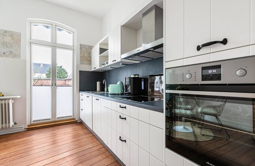 A section of the impressive apartment in the listed residential and commercial building has been converted into a maisonette. This extraordinary apartment with the staircase within the living space is flooded with sunlight. The bedroom is located in the attic. The wonderful shower room is well ventilated with a high window. The unusually large kitchen has a seating area and an exit to the balcony. Utility room with washing machine and dryer!