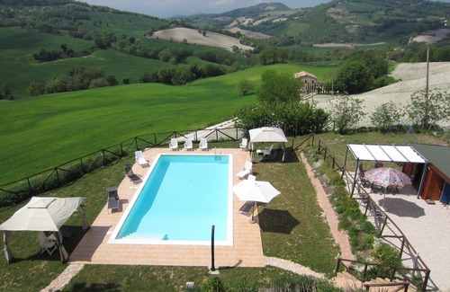 Shared swimming pool of 12x6m (1.5 m deep) with expansive views of the pristine environment and Apennines with deck chairs, umbrellas, outdoor toilet and shower. Summerhouse with tourist information, games, refrigerator and porch with garden furniture. Free parking. Playground for toddlers. Building is surrounded by big open garden of 3500 m² with various fruit trees (cherries, figs, persimmons, almonds, apples, plums, mulberries, apricots) which can be picked by the guests. Hammock and badminton in the garden.