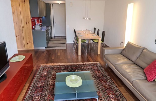 "Apt B 096", 2-room apartment 56 m2 on 9th floor. Comfortable and cosy furnishings: living/dining room with satellite TV (flat screen). Exit to the balcony. 1 room with 1 double bed (160 cm, length 200 cm). Exit to the balcony. Alcove with 2 beds. Open kitchen (oven, dishwasher, 4 induction hot plates, toaster, electric coffee machine, Capsules for coffee machine (Nespresso) extra, combination microwave). Bath/WC. Large balcony, south facing position. Balcony furniture. Beautiful view of the mountains and the countryside. Facilities: hair dryer. Internet (WiFi, free). Please note: non-smokers only. Instead of an enclosed bedroom, some sleeping areas are located in an open-plan area (gallery, alcove, etc.).