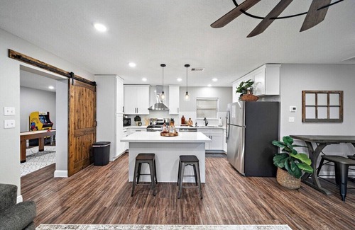 Spacious 4-bed, 2-bath home sleeps 10 with modern vinyl plank floors & sleek quartz countertops. Game room fun awaits with a classic Pacman arcade!