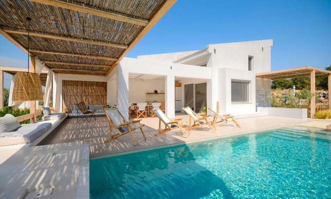 Spanning three levels and fully air-conditioned, Aristi Tessera can accommodate up to seven guests, making it ideal for families or groups. One of its standout features is the unique outdoor kitchen, seamlessly integrated with the terrace, offering easy access to the courtyard and pool area.