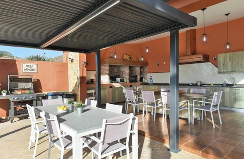 Unwind by the villa's private pool (not heatable), set amidst beautifully landscaped gardens and a serene terrace. The outdoor dining area and gazebo provide the ideal setting for enjoying al fresco meals under the Fuerteventura sun, with picturesque views extending to the ocean.