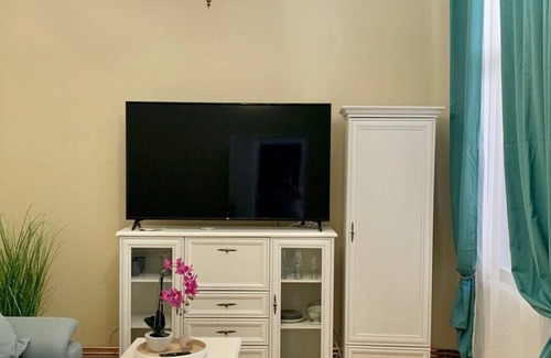 The apartment is located on the first floor, in a beautiful historic building. It has a bedroom with a queen bed, a closet and a TV, a living room with a sofa bed, smart TV, and a kitchenette with refrigerator, freezer, microwave, coffee machine (coffee caps, tea, sugar and water)