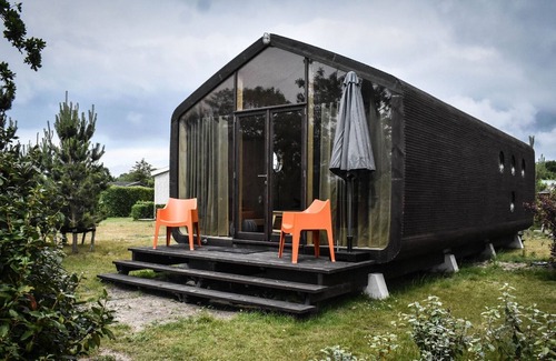 The beautiful accommodations at De Klepperstee holiday park catch the eye immediately due to their wonderful design. The use of special and sustainable materials gives the cabins a very attractive appearance. The electricity comes directly from the park's own solar park and the holiday homes are ideal for families. The surroundings offer beautiful beaches and breathtaking nature reserves. Brouwersdam and Grevelingen Lake are less than 5 minutes' drive away and the region also offers a large number of high-quality fish restaurants. Spending the night in a house made of recycled cardboard; a bit strange perhaps, but you will be amazed by the atmosphere and comfort! This 5-pers. type (NL-3253-111) has a living kitchen at the front and a sofa bed suitable for children. At the back you will find a sleeping area with a double bed which is for the most part separated from the kitchen diner by a bedroom with bunk beds and a bathroom. This creates a corridor, as it were, from front to back. The cabin has a terrace at the front and back, a picnic table and garden furniture. This cabin is located near the beautiful centre building with restaurant and the natural swimming pond.
