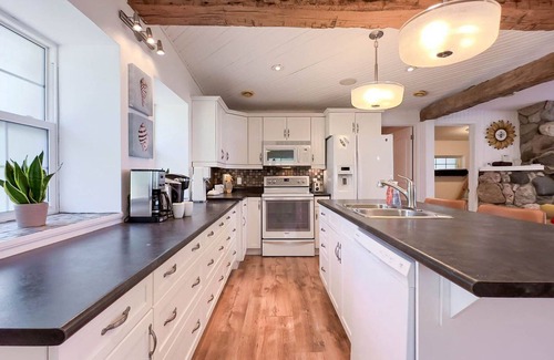 Open concept featuring reclaimed barn wood beams, thick stone walls, and an airy interior with a full wall of windows that makes the most of the phenomenal views, the Bedrock Beach House inspires a deep sense of peace and happiness. The open kitchen is clean and bright with everything you need to prepare meals in. Fridge, Stove, Microwave, dishwasher etc. Seating for 4 at the dining table plus an additional 3 seats at the island where you can chat with the chef and enjoy a meal together, all the while looking at the lake.