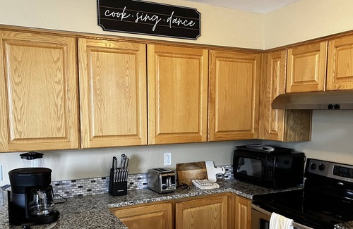 + Fully stocked kitchen with pots/pans, dishes, glassware, cookware, bowls, coffee cups, utensils, baking dishes, coffee maker, microwave, everything you need for an evening meal.