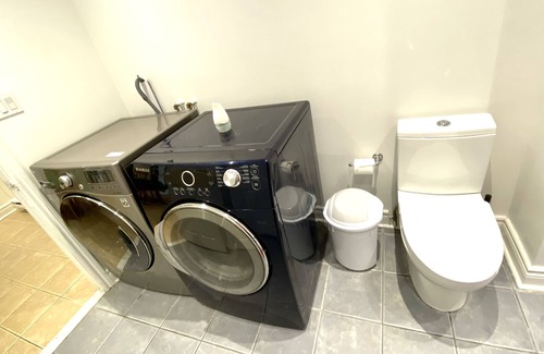 The kitchen is fully furnished and has a dining space in it. The bathroom has all the amenities, and the laundry machines in the corner.