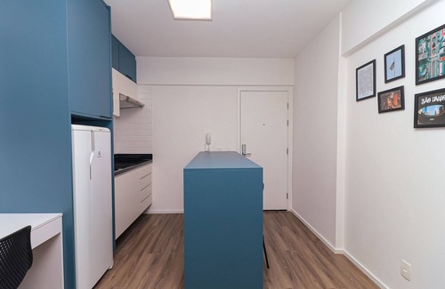 The studio is spacious and complete with warm tones and a balcony overlooking the city. This is an accommodation for those looking for practicality and comfort, as it has a kitchen, comfortable bed, built-in carpentry and air conditioning. In addition to the apartment being wonderful, the building in which it is located has a swimming pool, gym, laundry (paid), and is next to the República metro station, making it convenient to access the city.