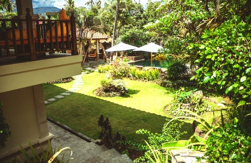 The Secluded and Luxurious Tunjung Bali Villa offers a large pool area with sweeping views of mountain tops, dormant volcanoes, lush greenery and furthermore- there is staff included in the price !!!