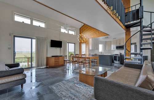 The open floor plan on the second level includes the living, dining and kitchen spaces as well as one bedroom, a bonus room with a queen bed and two full bathrooms. There is an additional sleeping space off of the master bedroom with queen sofa bed in an all-season room, a great spot to take-in the evening reflections off the canal of the wildlife refuge and all its wildlife. The great blue heron typically takes breakfast off the property here in the canal each morning. The Osprey in the platform nest visible in the rear of the property is currently raising young. It’s truly a special environment – where the wide-open views are the priority, and you don’t see neighbors from the main living area while taking it all in.