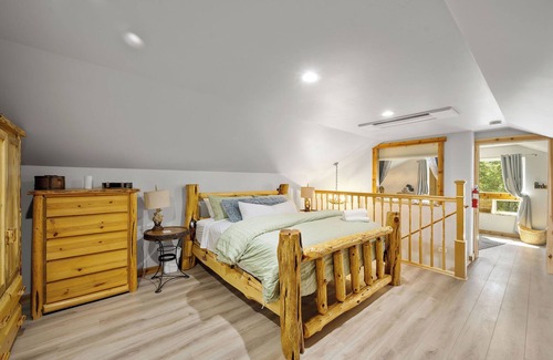 Head up stairs and you will discover a beautiful lodge pole king bed and a seperate bedroom with 4 twin beds. The beautiful bathroom features a claw foot tub that looks out toward the vast property.