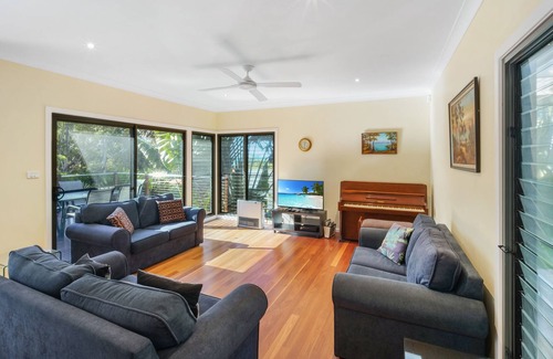 Enjoy the beach / creek which is a short 5 min work from the home. Spot whales from front deck and listen to amazing chorus of birds in the reserve across home, enjoy mountain views from back deck.