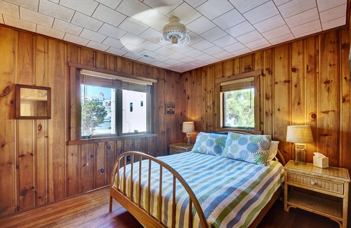 Nestled on the second floor, our cozy Coach House exudes beachy charm with its knotty pine walls, wood floors, and open-concept design. Ideal for up to 4 guests, it includes a queen bed in the bedroom and a pull-out couch in the living area. Features include: