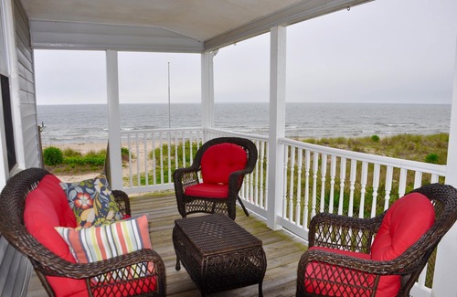 This house sits on a Public Beach - But ........ No public Parking ...... which means no crowds!!! This beach cottage overlooks the Chesapeake Bay, the Atlantic Ocean and a nine mile beach! Custom designed and fully equipped kitchen with granite counter tops, porch off the kitchen outdoor shower and BBQ. Enjoy a panoramic view of the entire beach from the living room or kitchen. The main beach house has 3 bedrooms (2 queen beds and 2 twin beds) ..... The 4th bedroom is actually an in-law suite located on the first floor. This is a complete apartment with 1 bedroom (king size bed) kitchen, living room and porch overlooking water. The inlaw suite has a separate entrance from the main house. Great for in-laws, two families, extra guests!