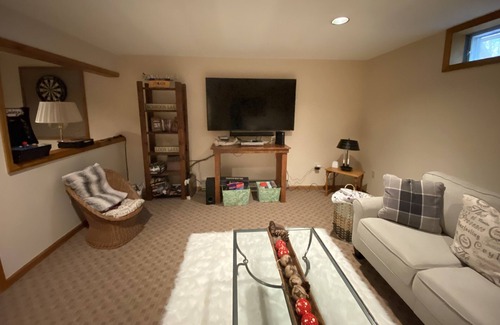 Beautiful house nestled on private 20-acre property, short drive to Gore Mountain and many hiking trails. House has high-speed internet with wired and/or wireless connections. Finished basement offers a family room with 65" TV on one side and ping-pong table and dart board/play area on the other. Laundry room with full size washer and dryer available for use.