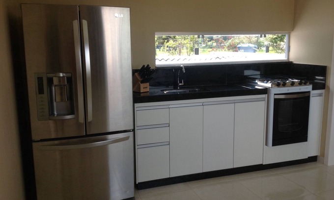 - Kitchen - complete with blender, coffee maker, toaster, all new. Imported refrigerator LG Duplex with freezer, 4 burner stove with oven, microwave, 04 taco for champagne, 04 wine taco, 04 Water glasses, set of pans with pressure cooker, full cutlery.