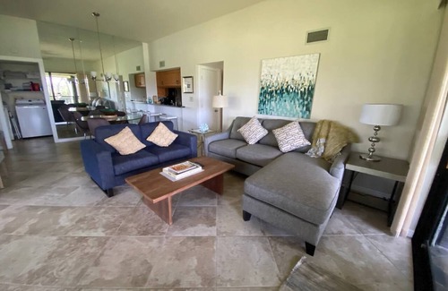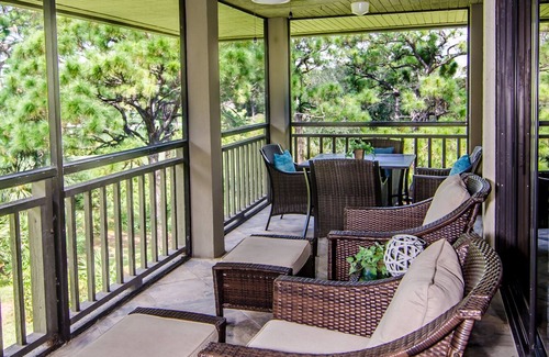 This 3rd floor corner unit with extra high ceilings and elevator access is one of the largest in Wild Pines (almost 1,500 sq. ft.), and features a beautiful wrap around lanai with Golf and lake views. It has an open floor plan with a combination living/dining area. Both bedroom suites have private baths and sliding doors to the lanai. The master suite is tucked away for privacy, with a king size bed and flat screen TV. The master bath has dual sinks, a deep tub and separate shower. The guest bedroom has twin beds and a flat screen tv as well. The bedroom and bath can be closed off behind a pocket door for complete privacy. The living room has a Queen pull out couch (comfortable for 2 young kids) and also a flat screen TV. All of the units surround the beautifully landscaped courtyard. The condo also has high speed internet and WiFi.