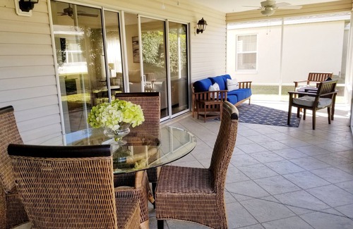 Walking distance to Lake Sumter Landing, where you will find shopping, restaurants and nightly live entertainment every night in Sumpter’s Landing square. About 1 block to Virginia Trace pool. This house is centrally located and easily accessible to either Spanish Springs or Brownwood Squares. Come and experience life in The Villages from this 3 bedroom 2 bath designer home. The living room is equipped with a 65" smart TV with wifi. The master suite has a very comfortable queen size adjustable bed, with a wall mounted 43" TV and door to the lanai. A guest room with a queen bed and a den with a sofa bed. The house has an open floor plan with a screen enclosed lanai that is fully furnished, the perfect place to enjoy your morning coffee or afternoon cocktail. With a $50 per person Temporary resident ID purchased from The Villages, you can enjoy all the benefits of home ownership, such as free golf at the 40 executive golf courses (minimal fee charged per person when using a golf cart), golfing at the 12 championship courses requires additional fees, swim at any of the recreation center pools, play tennis, pickleball or sign up and participate in over 2000 organized clubs and activities.