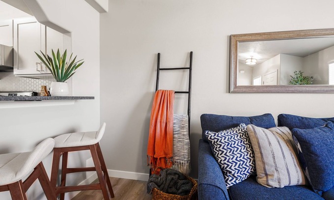 You enter the home into the bright, beautiful living room that has a large comfy sectional couch and a 65” ROKU TV where you can easily access all your streaming accounts. The bar area has 4 barstools and looks into the kitchen making it feel very open and inviting. The dining area has a table that can easily be converted to accommodate more guests and has 4 chairs.