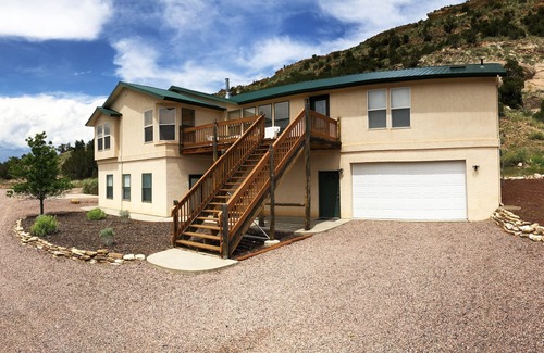 Beautiful 4 bedroom, 4 bath House with Great Mountain Views! The Skyline House is within minutes of the Royal Gorge Bridge & Park, rafting, zip-lining, mountain biking and world class fishing and much more. The house is on a private 150 acre property only 2 miles from the Arkansas River & 2 mins from Canon City! 2400 sq. ft. of living space plus a 1600 sq. ft. finished & furnished basement. Fully furnished kitchen, 6 beds, futon & other sleeping options. Plenty of space for your group adventure! *Garage is unavailable for use and events/ parties are not allowed.