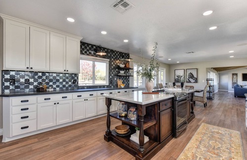 Located on 20 beautiful acres, this home is the perfect location for any desired vacation. Surrounded by open land and orchards there is plenty of room to roam and enjoy nature, play games in the grass surrounding the home or lounge by the pool. The inside of the home is newly remodeled and beautifully decorated to ensure your stay is comfortable and relaxing. With a large, open kitchen with lots of counter space, 2 ovens, 2 dishwashers and full size side-by-side fridge and separate freezer it's a dream kitchen for any group.