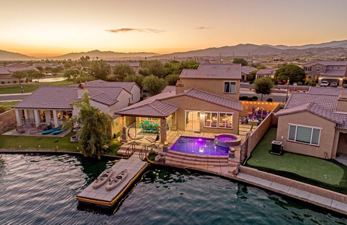 Enjoy a beautiful lakefront home in the desert! Minutes away from Coachella, Stagecoach music festival, and casinos. A water lover's paradise! Accommodates groups up to 12 looking for a spacious retreat or couples looking for a romantic getaway, complete with panoramic lake and mountain views. For security purposes, since we don't live here full time, cameras are located on the outside property only.