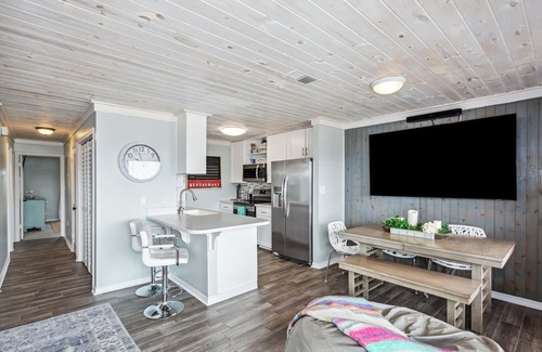 The master bedroom boasts a plush king-sized bed, providing a peaceful haven for restful nights. The guest bedroom features a versatile queen-over-queen bunk bed along with an additional queen bed, accommodating up to 8 guests comfortably. All TV's are Smart TV's for everyone's enjoyment.