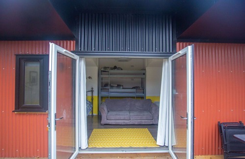 You will be staying in a 1-room chalet called "Dougie's" on the ground floor. The chalet is suitable for a maximum of 2 adults and 3 children. It features an open living/dining room area with modern and comfortable furnishings, including 1 set of 3 bunk beds, 1 double bed, a dining table, and a TV (flat screen). The chalet has a shower/WC (bathroom) and an exit leading to the veranda.