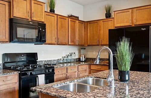 The kitchen has granite counter tops, brown wood cabinets and black appliances. You'll find the kitchen furnished with everything you need help you prepare a delicious home cooked meal.