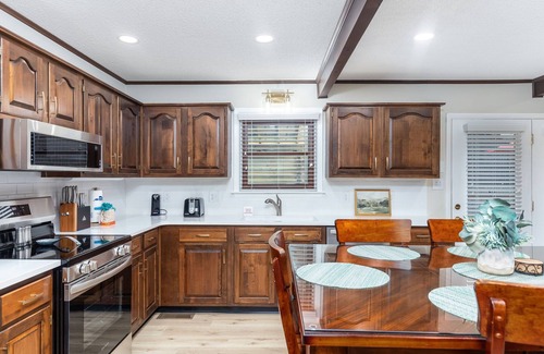 Renovated kitchen with quartz counters, stainless appliances, Keurig, bar seating, and dining for 6