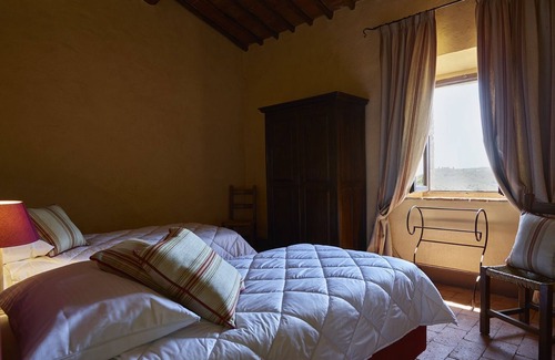 Bellavista is a beautiful tuscan house, divided into 8 apartments, located in the domaine of Castello di Bossi, in the sienese hills of Chianti Classico, just 18 km from Siena. Bellavista is 400m far from Castello di Bossi. Guest apartments feature raftered ceilings, terracotta-tiled flooring, elegant portals. They are all independent units, with private outspace, housed in age-old buildings, which have been refurbished to an excellent standard and furnished in an elegantly rustic style. Guests can choose from a number of comfortable apartments that accommodate from two to seven people. Private swimming pool and barbecue. In the adjacent lawn the farmhouse, in a panoramic and dominating position the Castle with its beautiful vineyards, is located the swimming pool with Siena views. Bellavista enjoys a very quiet position and is inserted in a wonderful landscape, which offers the possibility of walking and cycling. A free tennis court is available at Castello di Bossi (400m). Castello di Bossi offer wine tasting and olive oil with classic Tuscan cutting boards. From October to December for the most passionate white truffles we provide our truffles with their dogs for white truffles hunting .S. Sano: max 5 pax, 90m2. First floor: kitchen /dining room with fireplace, 2 double bedrooms, 1 passage room with single bed and 1 bathroom