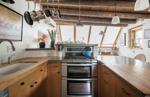 Best Casa is a hidden jewel only a block from Taos Plaza. It is part of a historical hacienda style adobe, over a century old, that once housed nuns working at Our Lady of Guadalupe Church. Newly renovated, the interior features an earthship style kitchen with south facing windows designed allow the sunlight to passively heat the room. The spacious kitchen is fully equipped and includes unique touches: a counter top made from a bowling lane, custom concrete countertops with inset planters, and a built in cherry cutting board. The living space has high ceilings, a plush wool rug and a large smart TV. The high-end sleeper sofa is very comfortable.