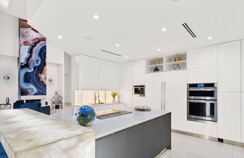 Step inside and a beautiful floor to ceiling custom acrylic fireplace immediately catch your eye as you take in the enormity of this massive space. From the dual marble waterfall counters which light up to the vault style wine cellar, this unique home has it all. With little expense spared during the remodel, the master suite features a huge walk-in closet which leads you into your private spa with a sunken hot tub allowing you to soak in style.