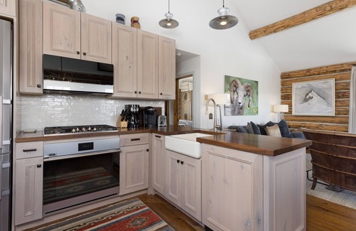 The open plan living area is warm and cozy with views from every angle and warmth from the gas fireplace nestled in the corner. A blend of tanned leathers, solid wood furnishings, beautiful artwork and western mountain décor give this home a true cowboy vibe. You’ll find all the comforts of home here, from kitchen amenities, board games and books to plush linens and upscale bathrooms. A true home-away-from-home.