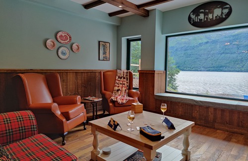 The rustic highland two storey cabin is character filled with cottage style-warmth and old-fashioned charm. The slate stone floors, rough wood panelling, beams, walls and vibrant colours reflect the traditional village homes scattered in the wilderness of the Highlands. This waterfront cabin has a spacious ground floor with a cozy bay window to enjoy the stunning views, a comfortable living area with a sofa-cum-bed and an electric fireplace, dining area, a fully equipped open kitchen and a utility room. The wooden staircase leads to two tranquil and quaint bedrooms with vaulted ceilings, with super king beds / zip & link beds and en-suite bathrooms. Picturesque views can be enjoyed from the balcony. Spa and restaurant facilities are available at the adjacent Hotel. Guests can also access the private pebble beach.This cabin is pet friendly.