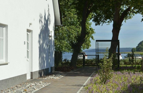 The modern furnished apartment is located on the ground floor of the apartment house. It is equipped with an open kitchen, a living room, a bedroom with double bed and a bathroom with large shower. Internet access is available. From the furnished terrace you have a wonderful view of the Großer Jasmunder Bodden. The apartment can be occupied by two people. One child up to 3 years old can stay free of charge. A cot and a high chair can be provided. Washing machines and dryers are available in the building and can be used. The associated parking is located on the fenced and enclosed property. Pets are welcome, but must be registered for a fee.