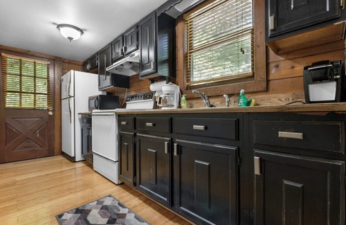 Azalea Cabin is a one bedroom riverside cabin conveniently located in the heart of The High Country. A short six minute drive will take you to Downtown Blowing Rock where you will find local dining and shopping, in addition to the community park. Hop on the Blue Ridge Parkway, about five minutes from the cabin, for scenic overlooks and numerous hiking trails. Nestled in the mountains, this modern cabin seamlessly combines comfort and style. A striking stone fireplace anchors the living area, surrounded by inviting leather furniture. Large windows offer sweeping mountain views, blurring the lines between indoors and nature. Modern design touches, from the well-appointed kitchen to tasteful decor, create a cozy yet refined atmosphere.