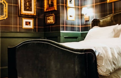This listing is for Marionne & Quinn, adjoined rooms inside of Bootleggers Lodge, a lakefront Lodge. A vintage velvety queen size bed sets the mood for this dark and moody lair. Dimly lit by a beautiful hundred-year-old chandelier, its charm allures visitors from near and far alike.