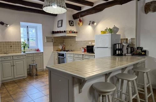 Character gite in the owner's house, including another gite (152018). Ground floor: separate entrance, large living room/kitchen area (microwave, fridge-freezer)/lounge area (fireplace/insert), laundry room, wc. Upstairs: 2 bedrooms (1 double bed. 2 single beds), bathroom, wc. Electric heating in supplement. Wifi internet access. Rental sheets, bathroom linen. Enclosed terrace. Garden furniture, plancha barbecue. Land not adjoining. Carport. Hiking and mountain biking nearby.