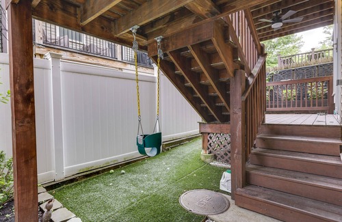 Downstairs you will find a large private bedroom with a queen bed, a half bathroom, and a washer/dryer. This room opens to a second outdoor deck and private garden with a toddler swing.