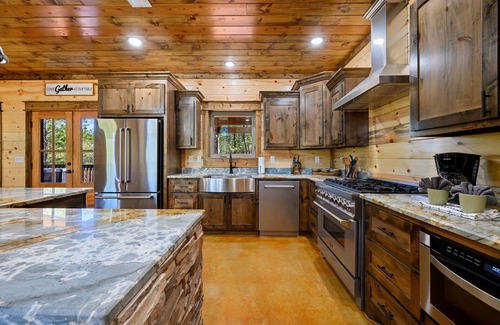 The king suites, each featuring walk-in showers, provide a sanctuary of tranquility. Additionally, the bunk room offers 4 Twin over Full bunks and a private bath, perfect for accommodating larger groups or families. The kitchen, with its open floor plan, granite countertops, and stainless steel appliances, is a chef's dream. The custom island with rockwork adds a touch of sophistication to this culinary haven.