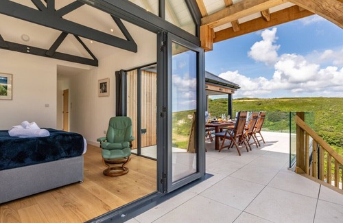 Let the panoramic view take centre stage when staying in this exceptional holiday home in vibrant Porthcurno. Although floor-to-ceiling windows and a 360-degree sea-view terrace are on offer, the owners have taken every care to ensure that the rest of this luxurious property is maintained at the highest standard to ensure only the best memories are made on this West Cornwall retreat. A fantastic option for larger groups, the property accommodates up to eight guests with a separate self-contained suite featuring a kitchenette and separate bathroom on the ground floor, an ideal choice for your guests of honour in a celebratory getaway.