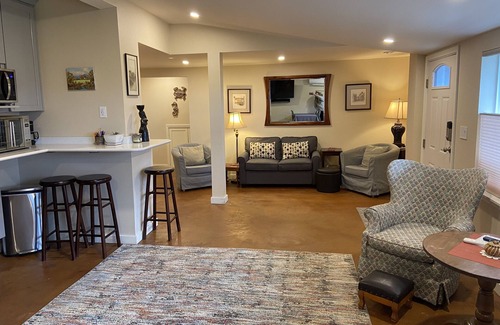 Newly remodeled daylight basement 1bd/2ba apartment above Newport's historic bay front. Directly above Samaritan Pacific Community Hospital, and a five minute walk to the beach. Walk to shops and restaurants. Own driveway/entrance, en suite bedroom plus additional bath, new and stocked kitchen, countertop convection oven, induction stovetop, microwave, larger apt sized fridge/freezer. Shared laundry area with main house. Big screens in bedroom and main room, Sonos sound system, Wifi, HVAC heat/AC.