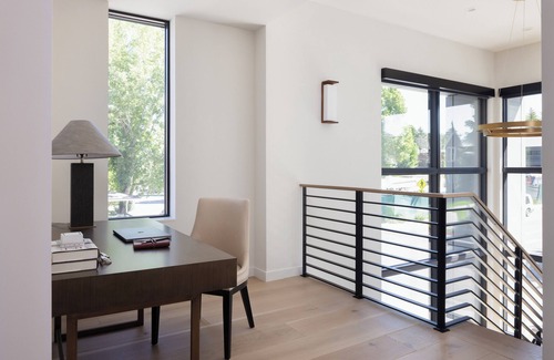 Throughout this townhome, the décor and color and materials palette are organic and inspired by the colors and landscape of Jackson Hole. The art collection includes works by exciting artists like Carrie Wild, whose work has been featured in Western Art + Architecture and Southwest Art, and whom you can sometimes watch work in her nearby studio inside the gallery she runs with her wildlife photographer-husband Jason, Gallery Wild.