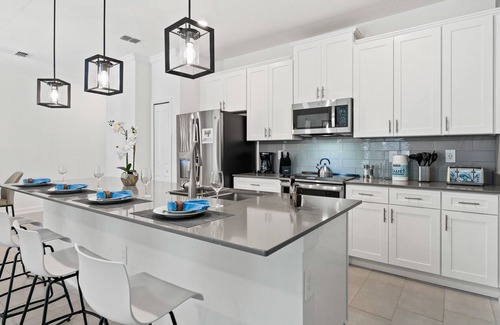 This very stylish 4-bedroom, 3-bathrooms, a vacation home can comfortably accommodate 10 guests throughout 1914 square feet of luxurious living space, offering an ideal size and layout for large families and groups traveling together. The moment you first arrive, this home makes a statement! Lush tropical landscaping surrounds the premises, creating a wonderful oasis-like atmosphere. Inside, the house comes with everything you need to feel as relaxed as possible during your stay, from air conditioning and in-unit laundry machines to wireless internet access and a fully equipped kitchen, featuring a breakfast table with all the necessary cooking appliances. Enjoy your culinary masterpieces around the formal dining room table with seating for 8 in elegance. This modern inspired home will make you feel as though you have transported to another land where time disappears and relaxation is king! Choose this home on your next vacation to sunny Central Florida.