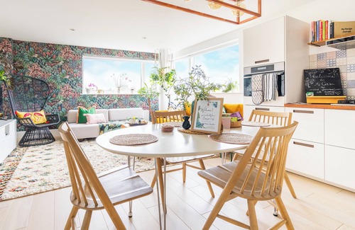 Experience vibrant & arty East End at our bright & spacious 2-bedroom flat by an iconic Brick Lane. This mid-century styled pad, flooded with light & bursting with colour offers a great workspace & a cheerful retreat in the heart of hipster London. With some of the best restaurants, bars and edgy fashion shops just steps away and easy access from all airports, this is your perfect base for exploring nearby Hoxton, Spitalfields, financial district & Central London. NEAREST TUBE: Aldgate East 5min.